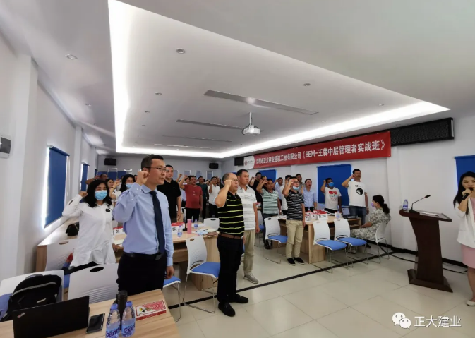 07月05日早上09:00王牌中层管理者实战班开学典礼仪式正式开始,正大建业总经理胡冷非就此次培训发表了开场致辞,并组建学习班委,分组分队、集体宣誓。